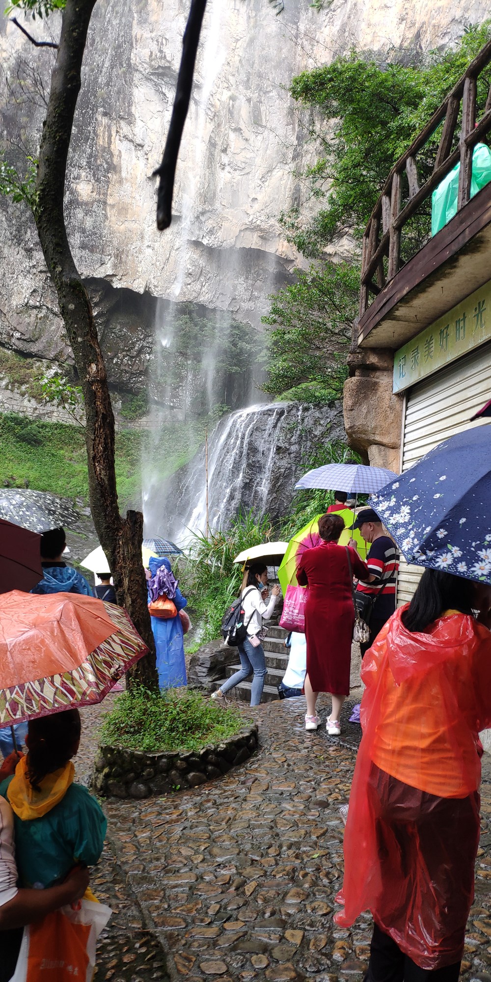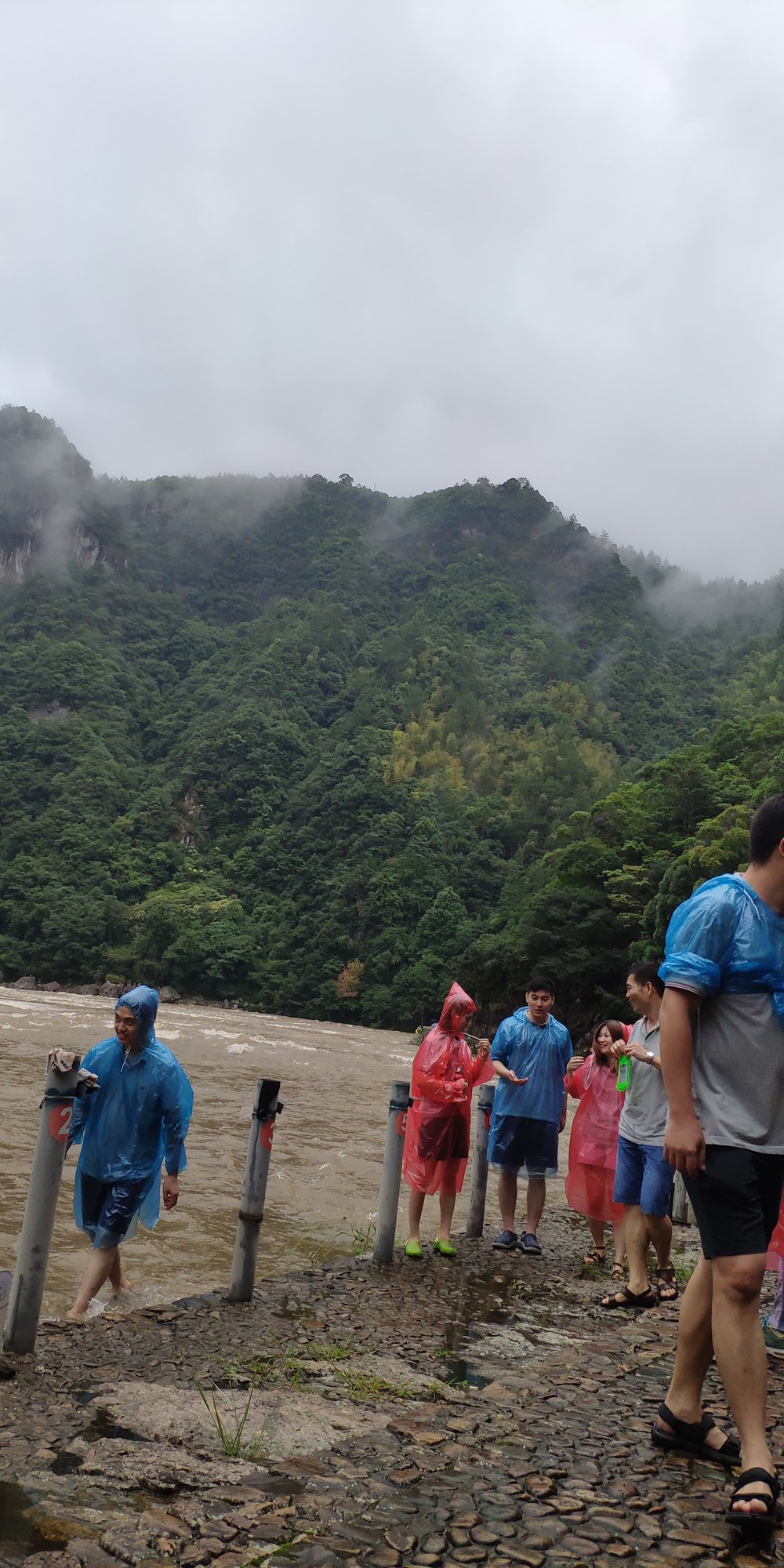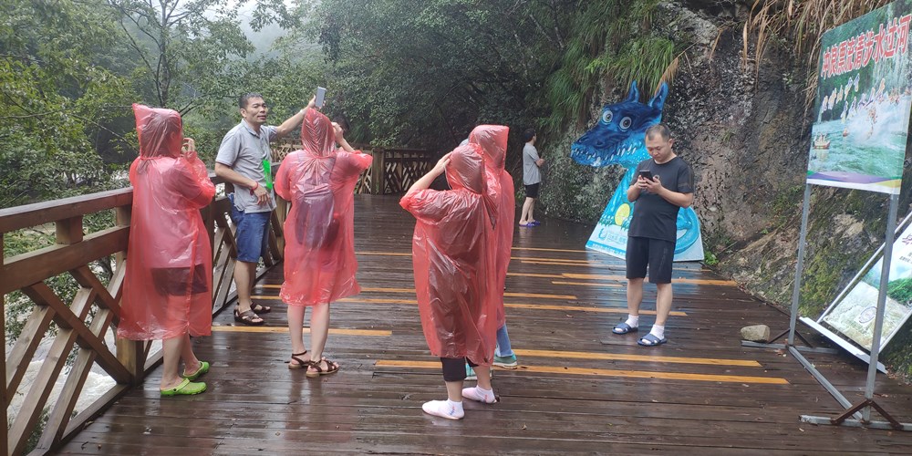 4个小时多的车程下了高速,直奔白水洋风景区,天空下着小雨。把车停在停车场,打电话给民宿老板,从网上预订好的民宿老板带着我们往检票口去,拿出手机翻出预订好的门票扫码进去,一人发了一双印有白水洋的袜子。