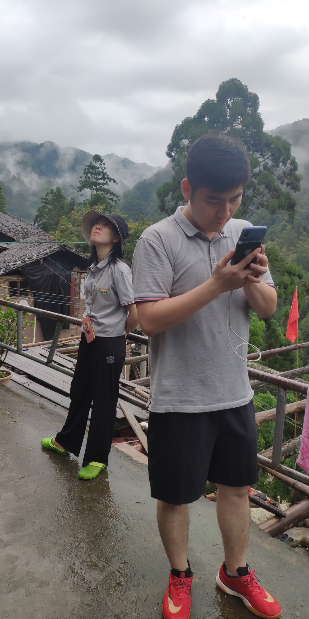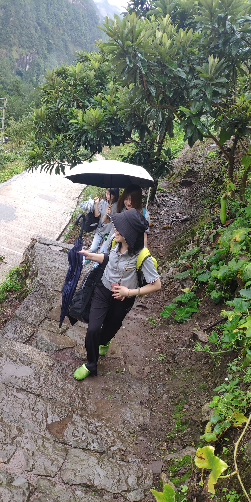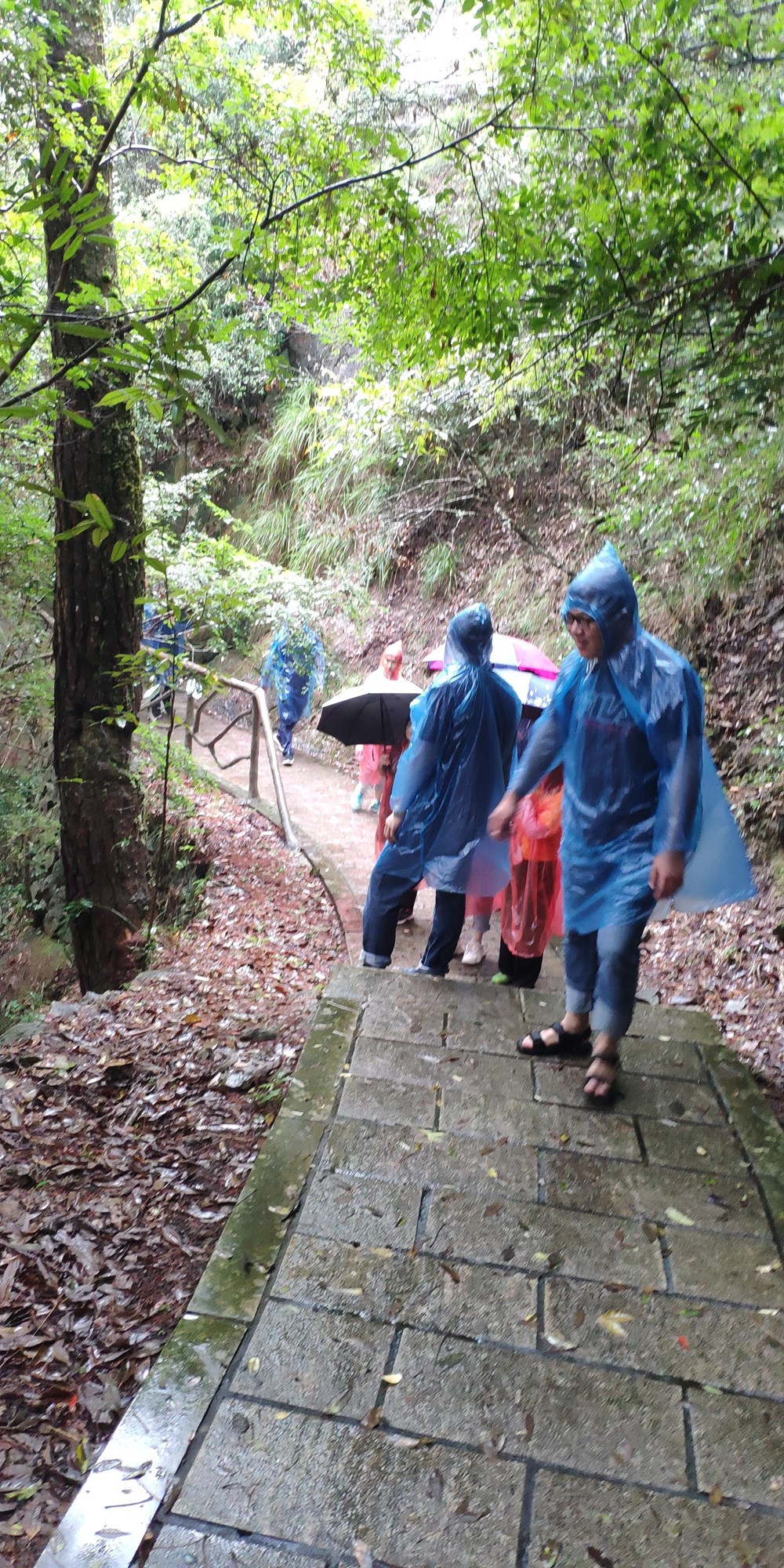 4个小时多的车程下了高速,直奔白水洋风景区,天空下着小雨。把车停在停车场,打电话给民宿老板,从网上预订好的民宿老板带着我们往检票口去,拿出手机翻出预订好的门票扫码进去,一人发了一双印有白水洋的袜子。
