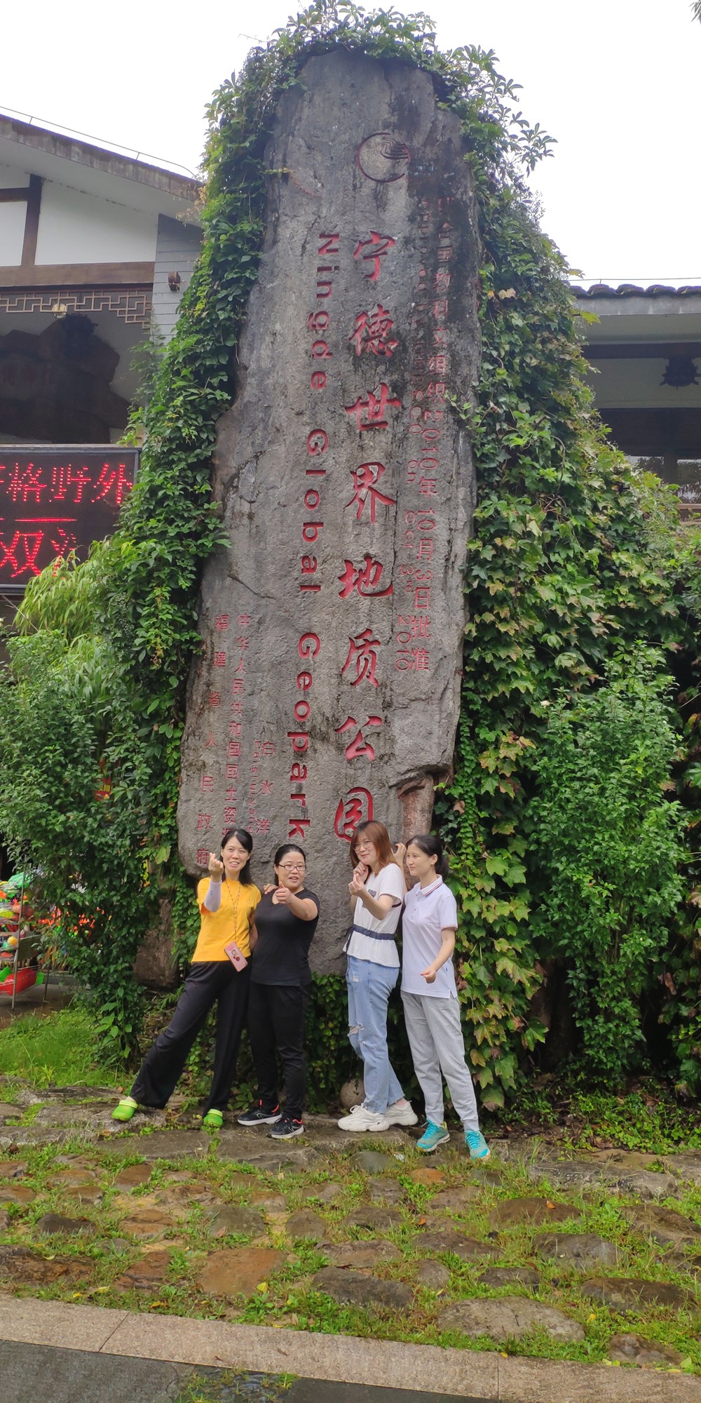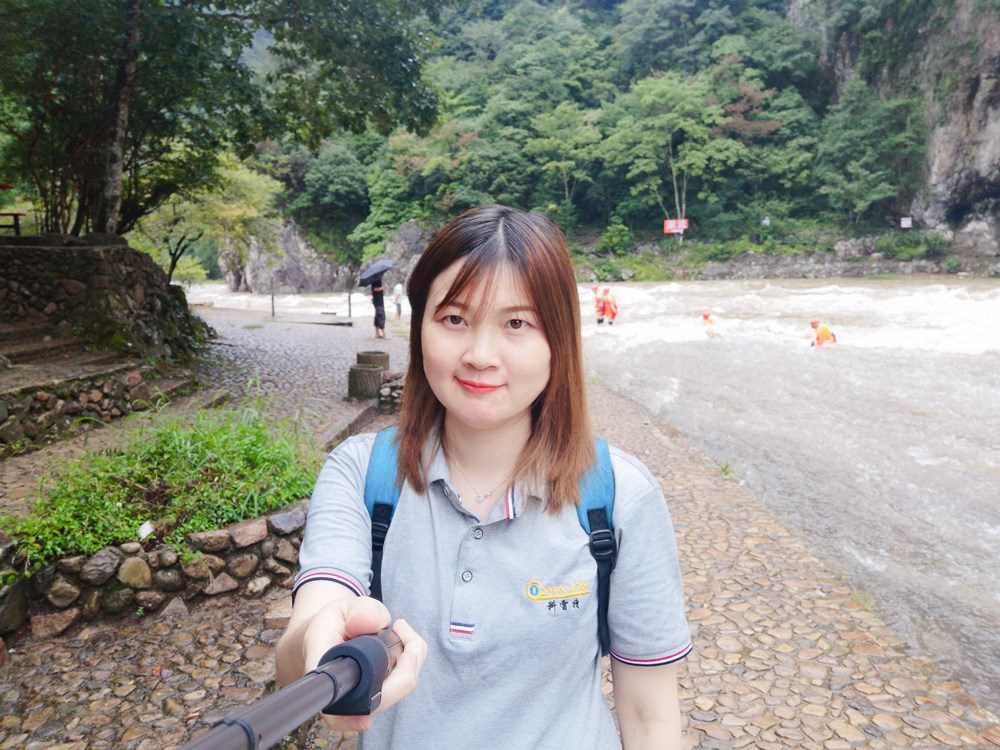 吃完早餐坐着民宿老板的小车,坐到观光车停放的地方,坐上观光车一直到了白水洋景区门口,补拍一下合影照。