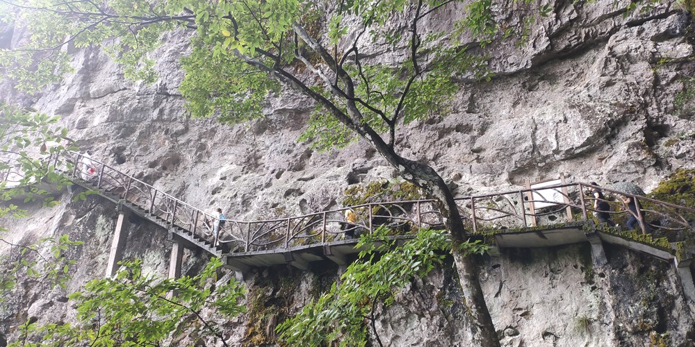 然后换坐自己公司的车,差不多半个小时到达下一景区鸳鸯溪。在谈笑风声中登上凌云栈道,去吸取那人间仙境的仙气,貌似有神仙气质,个个都成了仙哥仙女。
